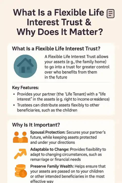 In basic terms, a Flexible Life Interest Trust enables you to pass your assets (such as your home or investments) down to the person of choice (usually your spouse or partner) for their lifetime, with the opportunity to ensure that when they die those assets pass on to your children or other nominated beneficiaries.